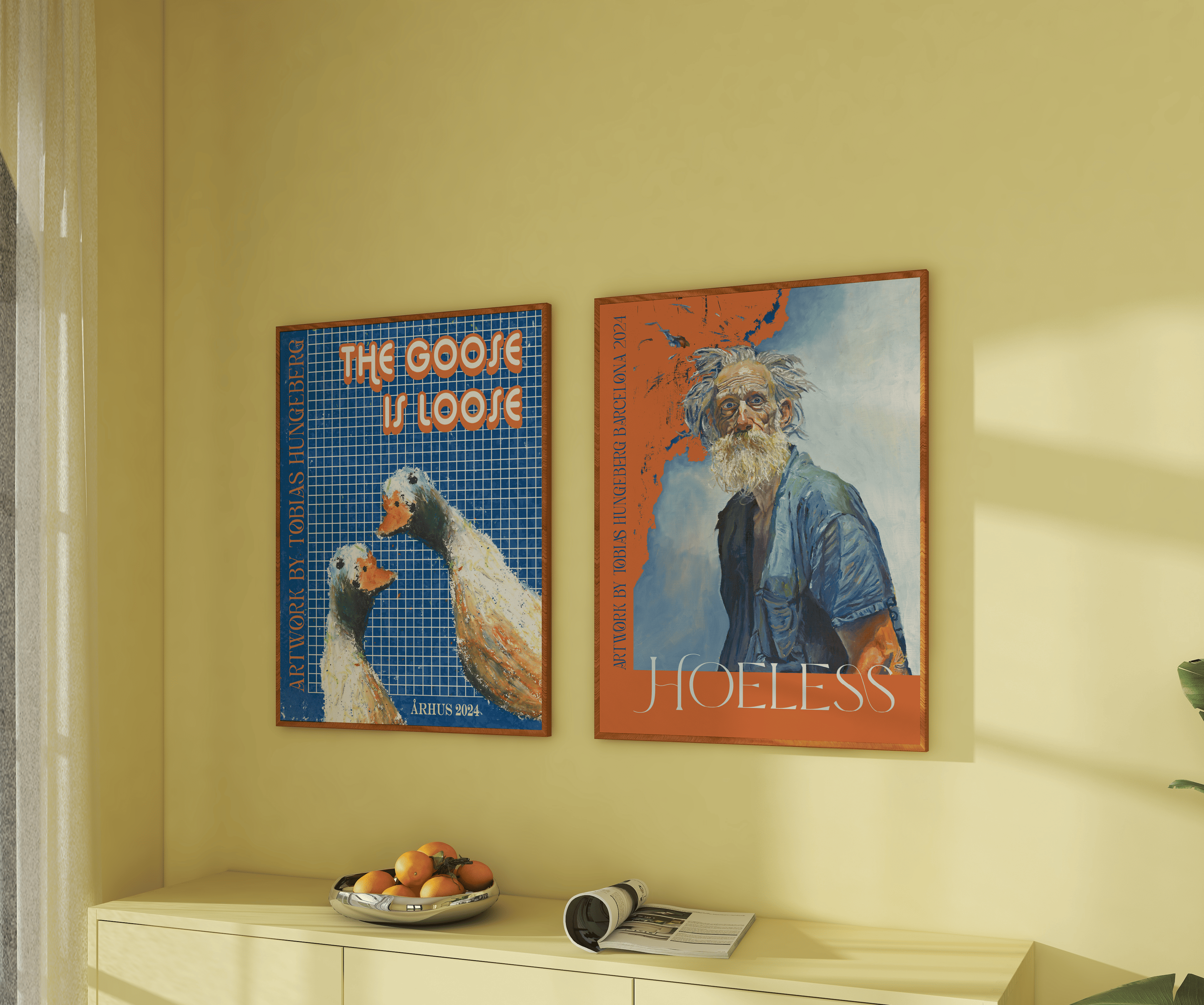 Looking for some fun colors to ad to your walls? Take a look at the eyecatching "THE GOOSE IS LOOSE" art poster in vibrant blue and orange colors.