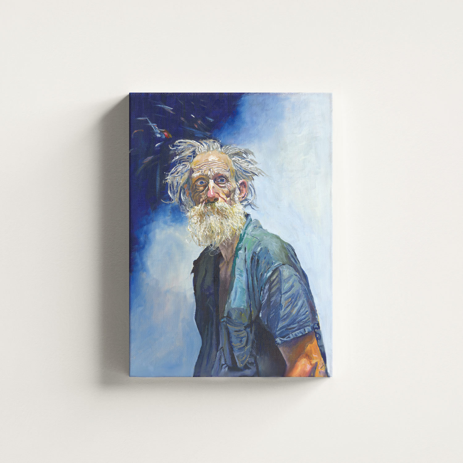 “Hoeless” art poster by Tobias Hungeberg isn’t here to blend in. Based on an original oil painting, this modern wall art delivers a raw, thought-provoking portrait of a homeless man – painted in striking orange and blue tones.