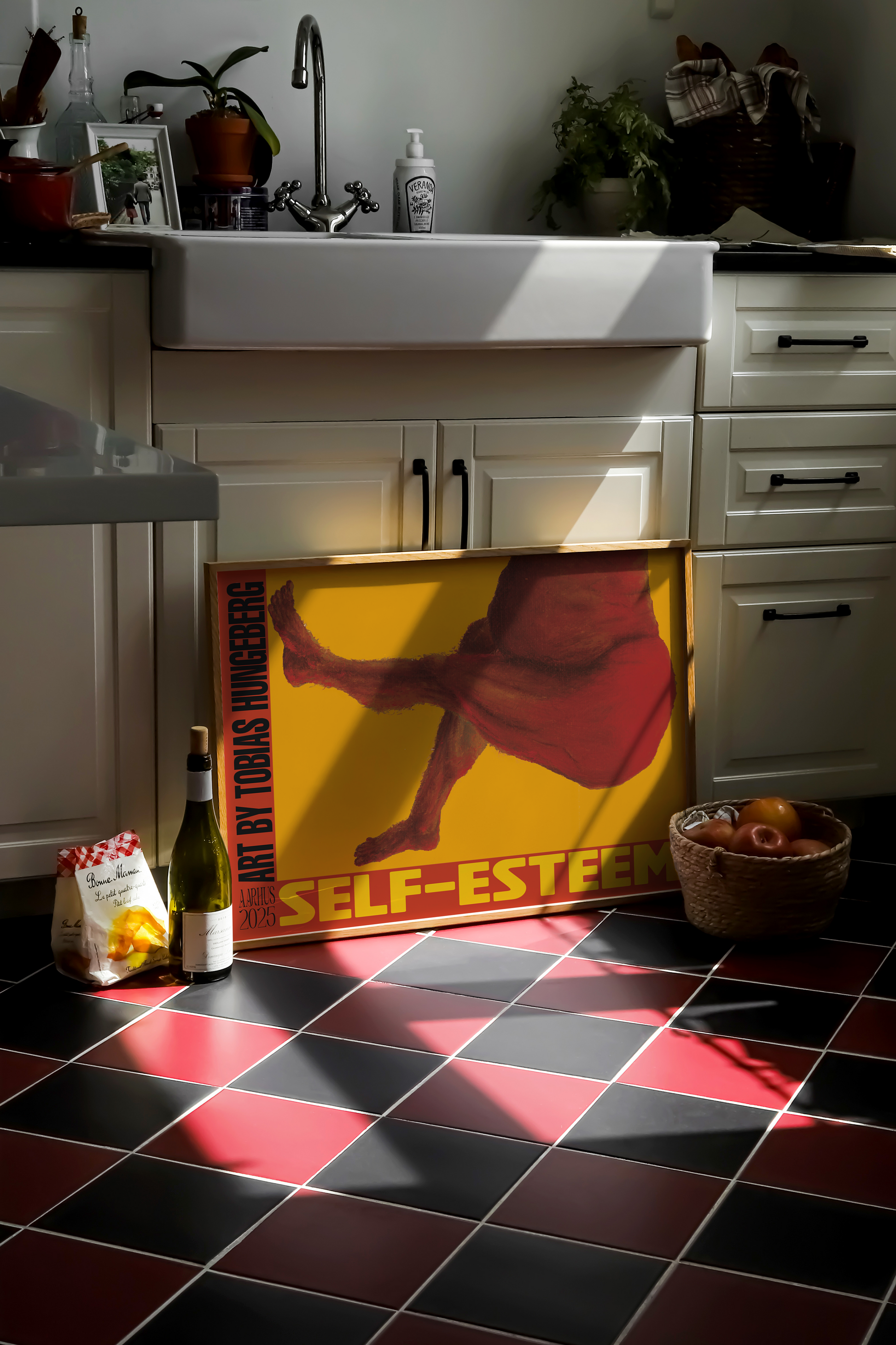 This poster features a bold fragment of Tobias Hungeberg’s original 2025 oil painting, titled Self-Esteem. Set against a vivid yellow background, the central focus is a powerful, partial depiction of a human figure - raw, red, and almost sculptural - evoking tension, vulnerability, and resilience.